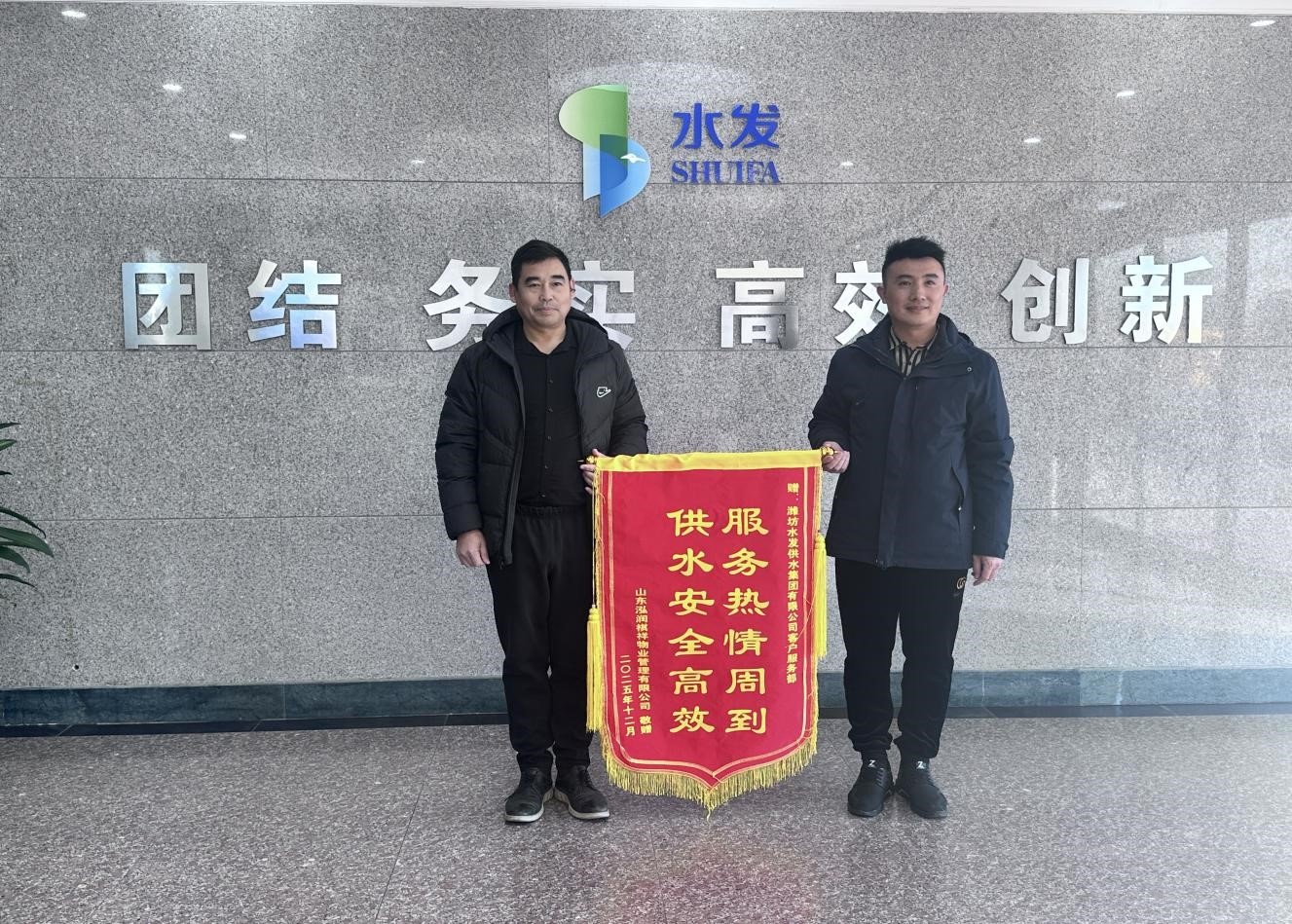 2025年 12月8日,濰坊水發(fā)供水集團有限公司客服部迎來了特殊的客人,合作物業(yè)代表將一面印有 “服務(wù)熱情周到 供水安全高效” 的鮮紅錦旗鄭重遞交到客服團隊手中,以最質(zhì)樸的方式,表達對供水服務(wù)的由衷感激。